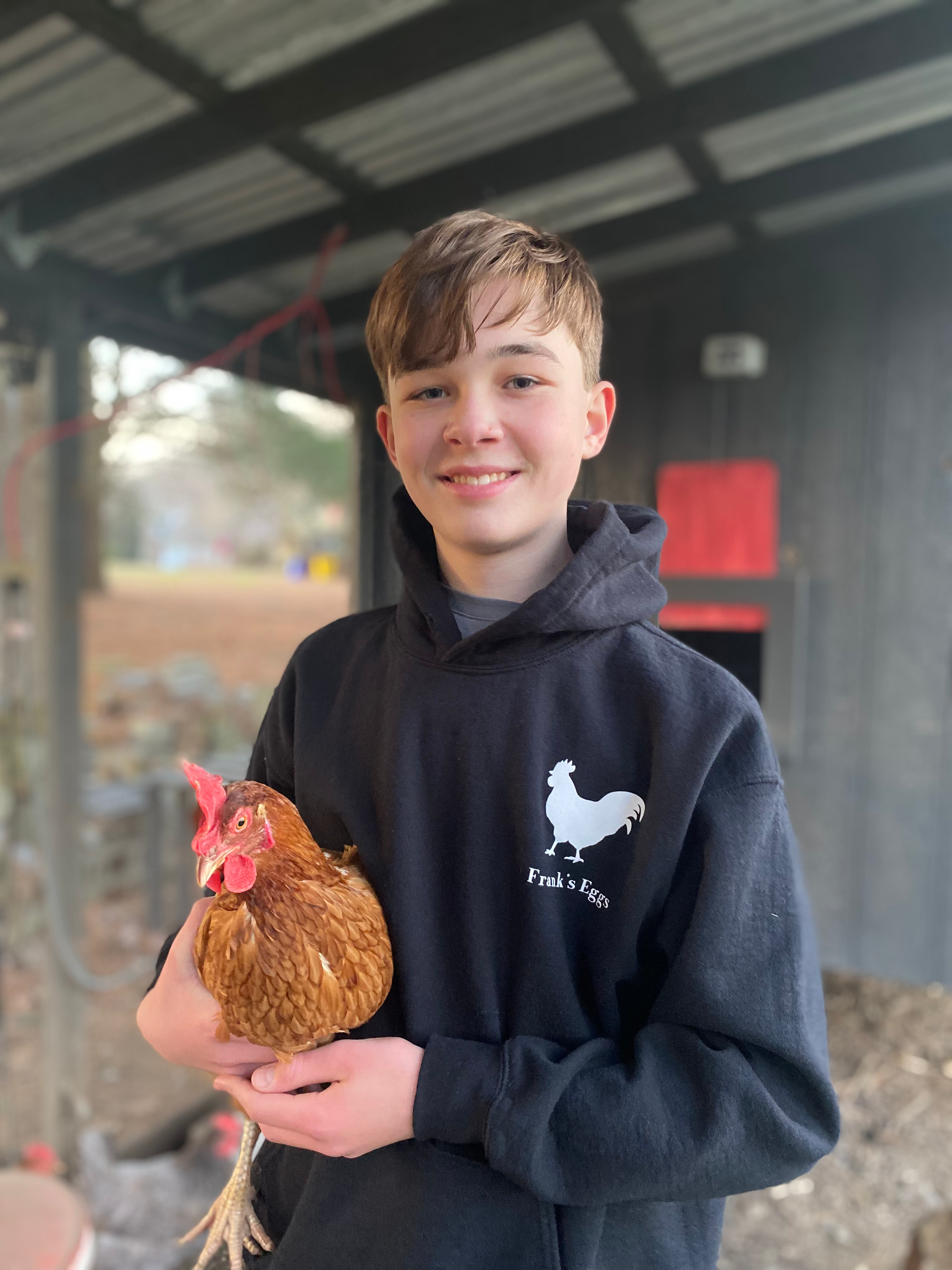 Hi, I’m Frank. It has always been a dream of mine to have a farm. So when I asked my Mom & Dad for my 12th birthday for chickens, my parents weren’t shocked. My Dad designed and built the coop and in the Spring of 2021, we bought 12 baby chicks. I have 3 types of chickens; Easter Eggers, Golden Comets, and Plymouth Rock.